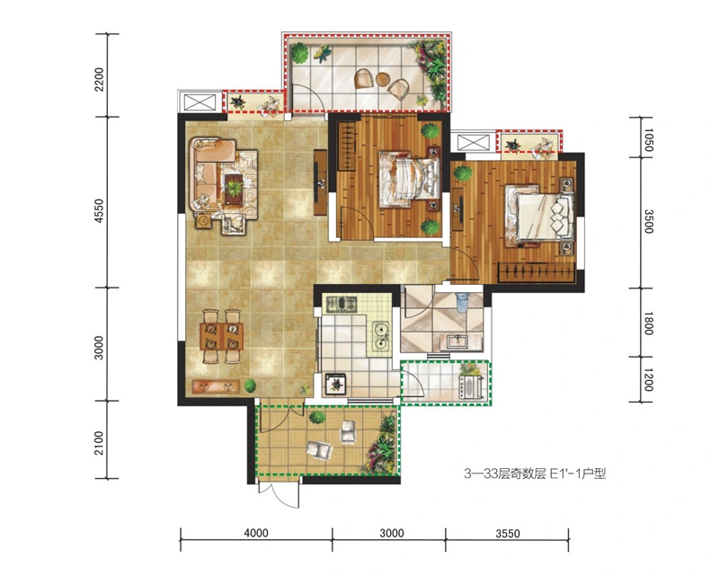 二期9号楼标准层E1-1户型【售罄】 2室2厅1厨1卫