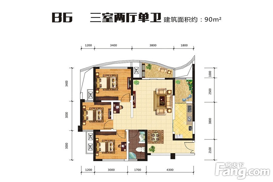 13/16#标准层B6户型 3室2厅1厨1卫