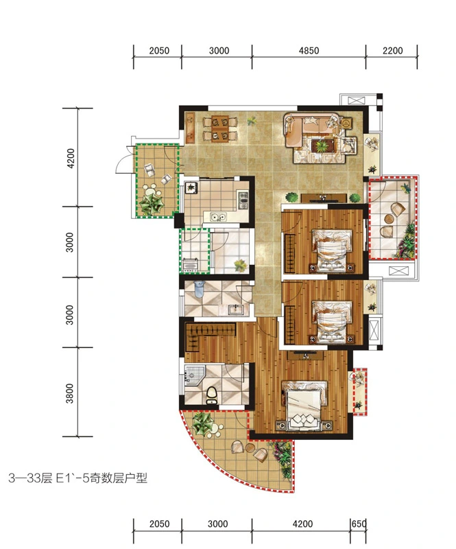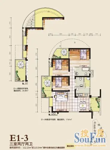 二期9栋标准层E1-5户型【售罄】 3室2厅1厨2卫