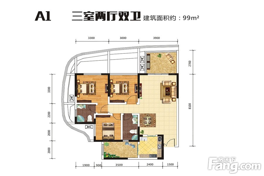13/16#标准层A1户型 3室2厅1厨2卫