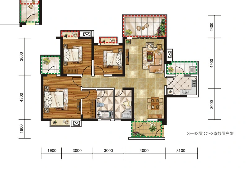 二期11号楼标准层C2户型 3室2厅1厨3卫